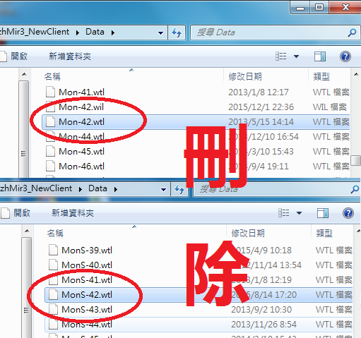 1.先把原本主程式中的Mon-42.wtl跟Mon-42S.wtl 兩個檔案刪除 檔案位置在 X:/zhMir3_NewClient/Data  X為你主程式放的磁碟位置