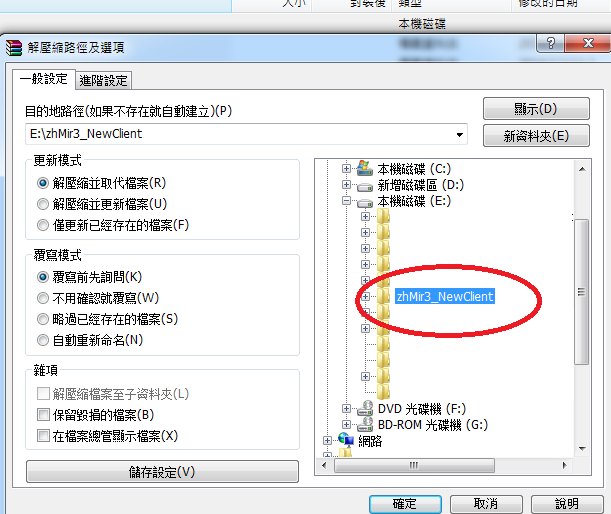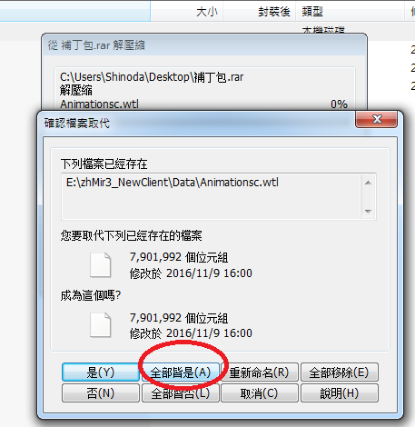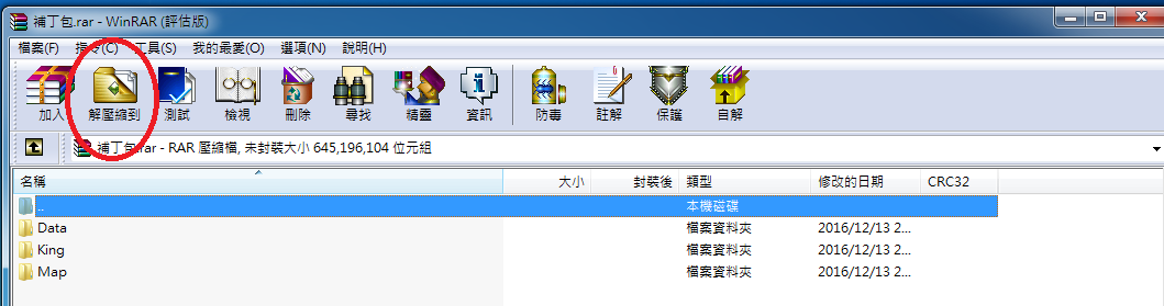 1.使用Winrar打開補丁包 沒有這個程式的話google打上去找 打開補丁包後什麼都不需要看懂 按"解壓縮到" (紅圈處)